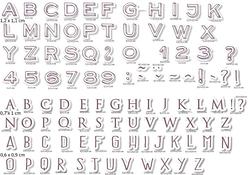 Tři abecedy v jednom balení! Fantastická vychytávka pro výrobu přáníček, do deníčků, alb Project life, na srapbook. Moderní fonty. Kvalitní gumová razítka na pěnové hmotě. Razítka mají hluboký reliéf a precizně propracované detaily.