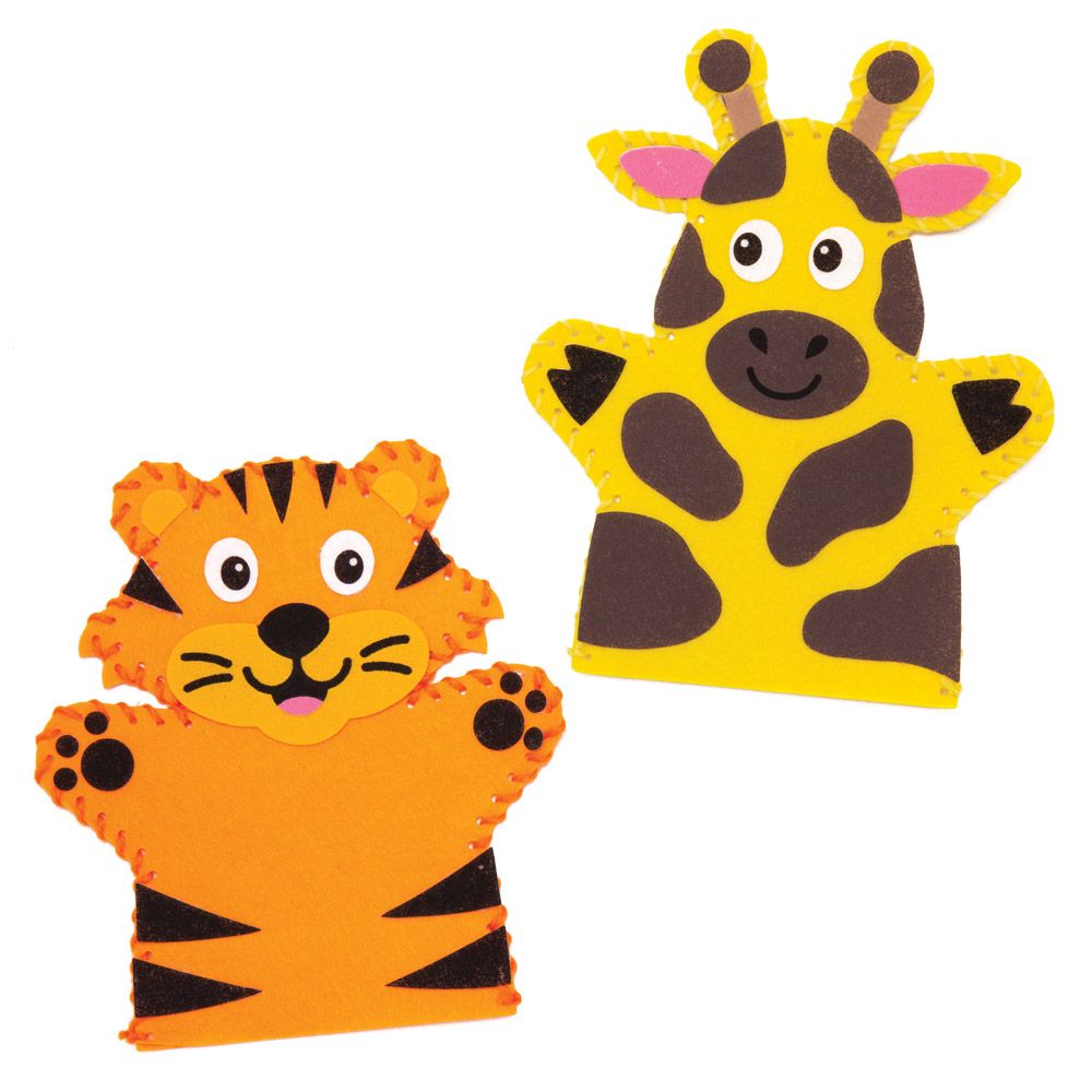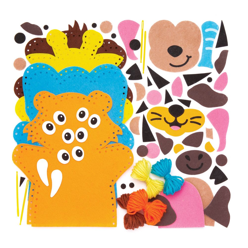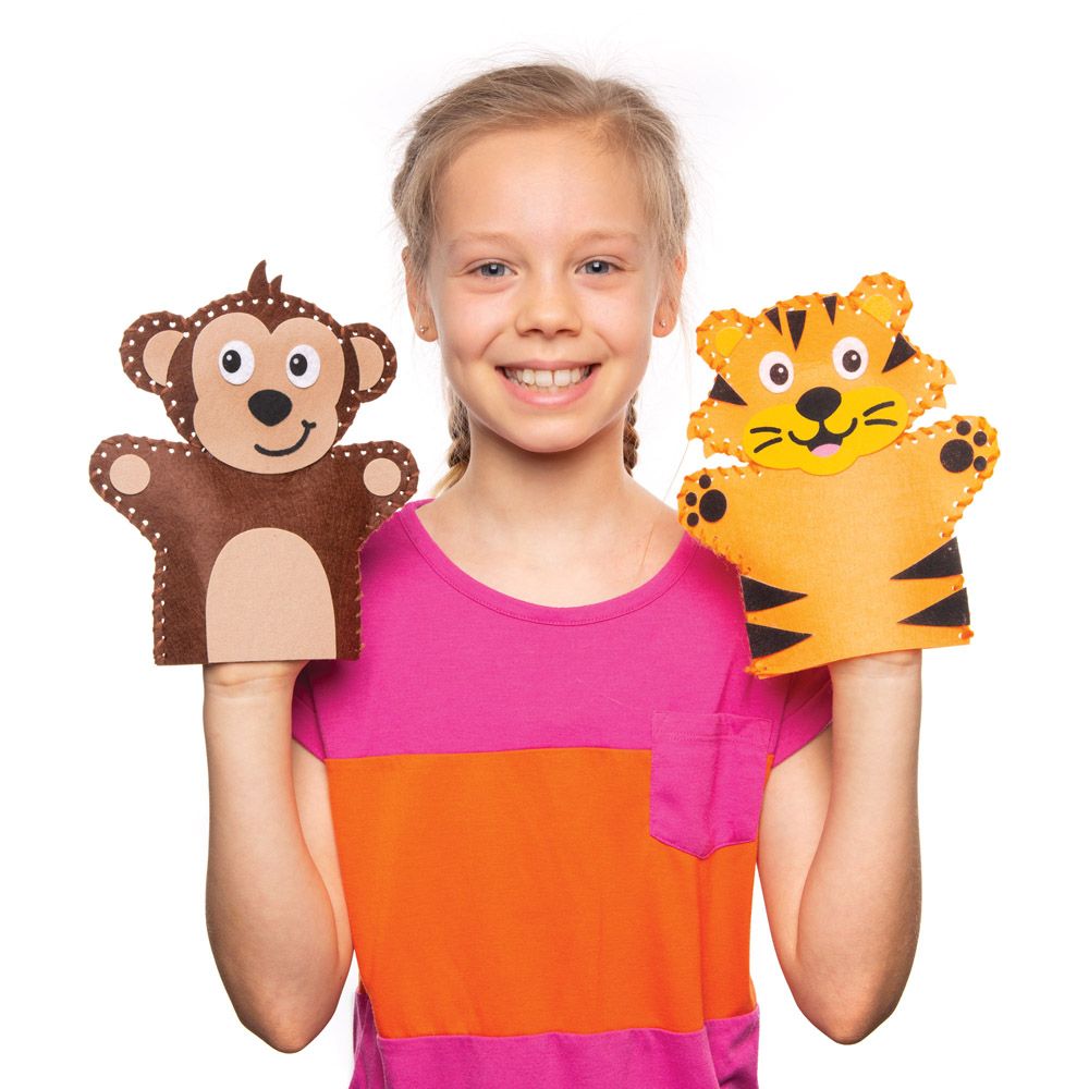 - Sada k výrobě maňásků obsahuje předděrovaný materiál ve 4 rozmanitých tvarech loutek v designu opice, tygra, slona a žirafy, plastovou jehlu, nit, dekorace a pohyblivé oči.
