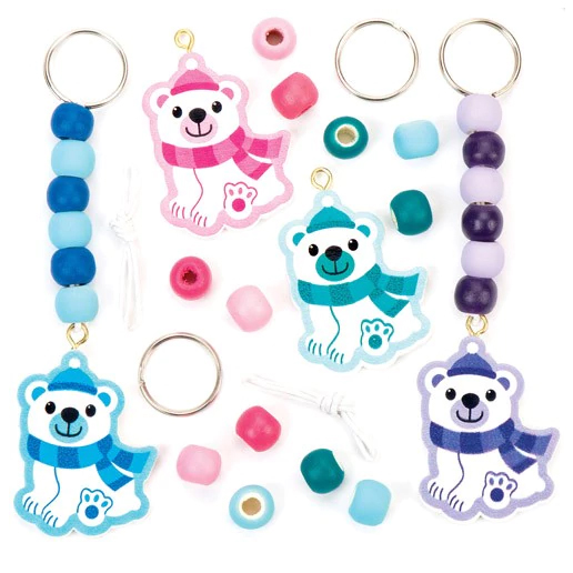 Sadak výrobě přívěsků na klíče, která obsahuje dřevěné korálky kulaté a ve tvaru polárních medvědů, šňůru a kroužek na klíče ve 4 různých barvách - růžová, modrá, zelená a fialová. Pokyny jsou zahrnuty.