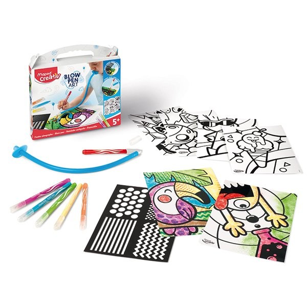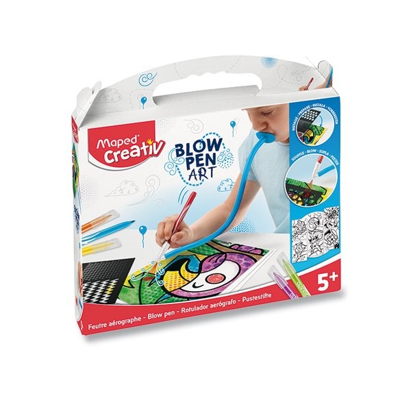 Sada obsahuje nástavec pro foukání, 6 barevných fixů, 6 předtištěných předloh, kde je možno kombinovat foukací pero s pastelkami pro úžasné ilustrace.