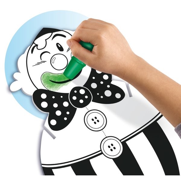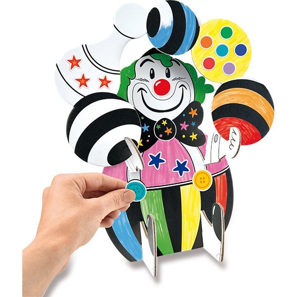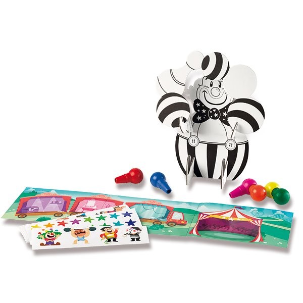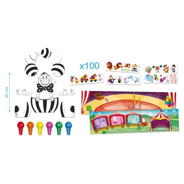 Dětská kreativní souprava v praktickém kufříku, který snadno otevřou i malé děti. Souprava obsahuje 6 barevných voskovek, 100 dětských samolepek, obrázek cirkusového prostředí a kartonového klauna, kterého lze snadno sestavit a vymalovat. Vhodné pro děti již od 2 let.