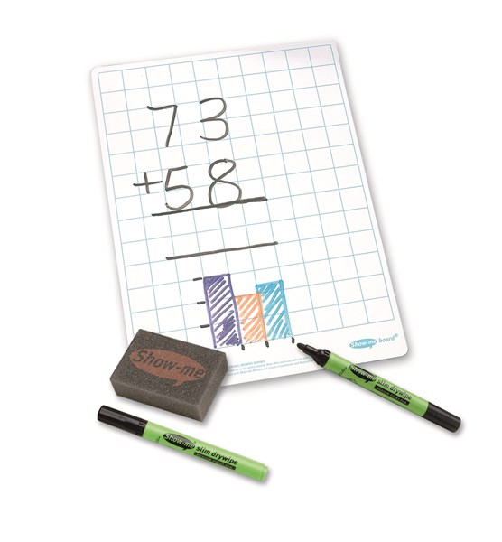 Oboustranně stíratelná tabulka A4 s potiskem čtverečků je vhodná k nácviku počítání, psaní, ale i kreslení na 1. stupni základních škol. Jedna strana tabulky je čtverečkovaná a druhá strany je prázdná. Součástí sady je tabulka, stíratelná fixa a houbička. All the benefits of the original Show-me® board. Additional feature of a light blue grid pattern forming 20mm squares. Assists young children to form numbers and characters within the squares.Very versatile – can be used for different activities in every subject – forming words, graphs, simple sums and more Ideal for graphs, charts, shapes & flow diagrams.A4 size – ideal for photocopying. Plain reverse side for standard Show-me® activities. Combination packs include whiteboards, medium tip pens and erasers. Each pack now includes a FREE Teachers’ Resources Booklet, packed full of ideas, tips and games.
