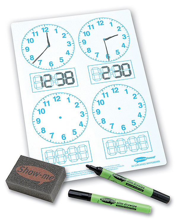 Oboustranně stíratelná tabulka A4 pro nácvik určování hodin na 1. stupni základních škol. Tabulka má z jedné strany vyobrazené hodiny bez rafiček a pod nimi předlohu pro zapsání digitálního času. Zadní strana je prázdná. Součástí sady je tabulka, stíratelná fixa a houbička. Balení obsahuje 10 sad.