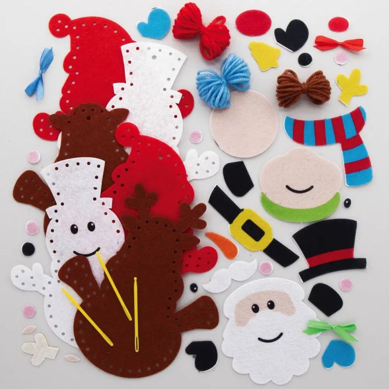 Zábavné, netradiční vyrábění vánočních ozdobiček. Sada obsahuje předděrované plstěné základní tvary, plstěné ozdobné části, plastovou jehlu a bavlnku, stuhy k zavěšení, pohyblivá očka, výplň. 3 postavičky - Santa, sobík, sněhulák, velikost 17cm.