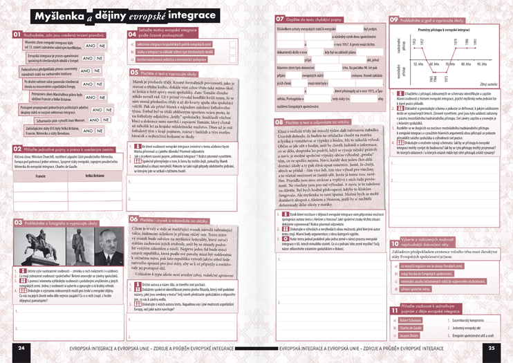 - Pracovní sešit nabízí širokou škálu cvičení – vedle klasických faktografických zadání (posuzování pravdivosti tvrzení, doplňování chybějících pojmů, přiřazování pojmů ke stanoveným kategoriím aj.) jsou výrazně zastoupena cvičení směřující k rozvoji dovedností žáků – práce s textem a ikonickým materiálem, posuzování a řešení modelových situací, identifikace problémů atd. Jednotlivá zadání pak kombinují individuální, párovou a skupinovou práci studentů.