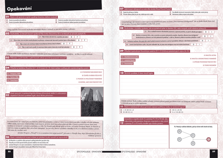 - Navíc se v pracovním sešitě za každým z tematických celků objevuje dvoustránkový oddíl Opakování, které ověřuje znalost klíčových pojmů a problémů příslušného celku. Po formální stránce je Opakování zpracováno tak, aby typem zařazených cvičení odpovídalo připravované podobě nové maturitní zkoušky.