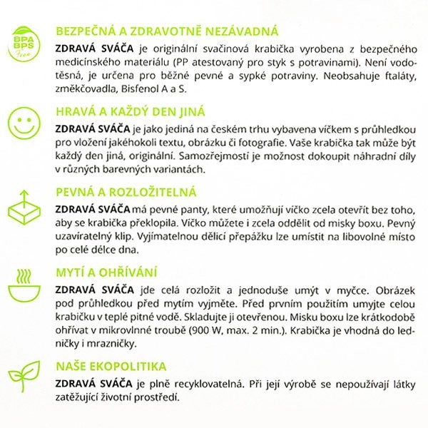 Svačinový box neobsahuje ftaláty, ani změkčovadla. Box je možné mýt v myčce nebo v něm ohřívat svačinky v mikrovlnce.
