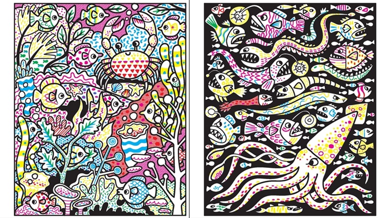 Brush water over the stylish, black and white patterns and underwater scenes and watch the vibrant colours magically appear to reveal sharks, sea turtles, jellyfish, a school of tropical fish and lots more. There’s a handy flap at the back of the book to stop paint seeping through to the page below.
