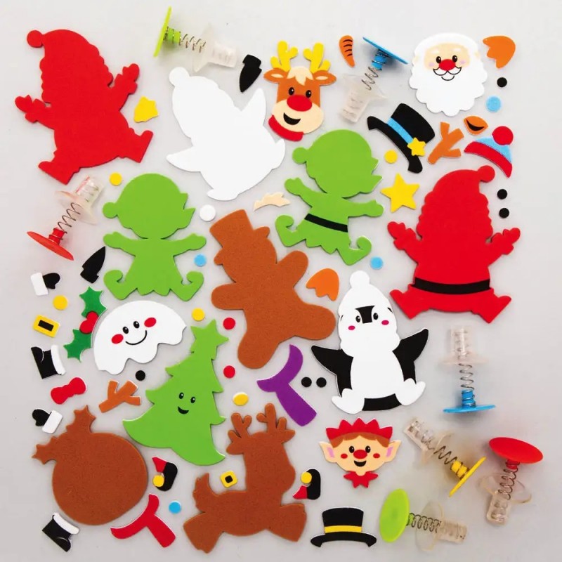 Veselé vánoční postavičky - Santa, perníkový panáček, skřítek, sněhulák, vánoční puding, sobík, tučňák a vánoční stromek. Sada obsahuje pěnové samolepicí základy, dekorace a pérka. Velikost postaviček je 8cm-10cm .