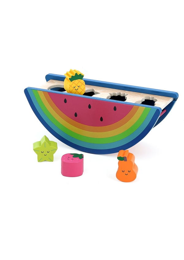 Dá si někdo hrušku? Nebo raději ananas, jahodu či karambolu? Vkládačka ve tvaru melounu podle návrhu Andy Westface potěší každé dítě. Tato raná hračka inspirovaná Montessori v jasných barvách má 4 tvarované otvory pro vkládání ovoce. Víko s otvory je posouvací, aby šly ovocné tvary jednoduše...