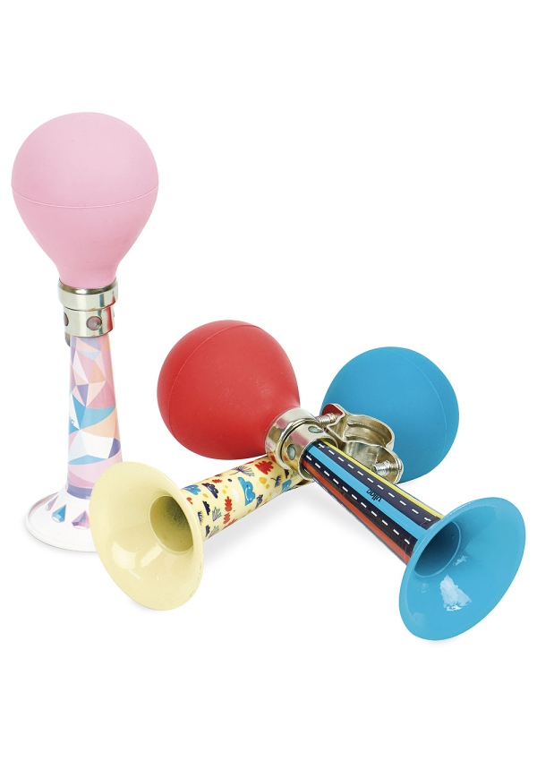 Klakson ve třech barevných provedeních, s kovovým očkem pro připevnění k řidítkům. Hlavní vlastnosti: vhodné na rám dětského kola