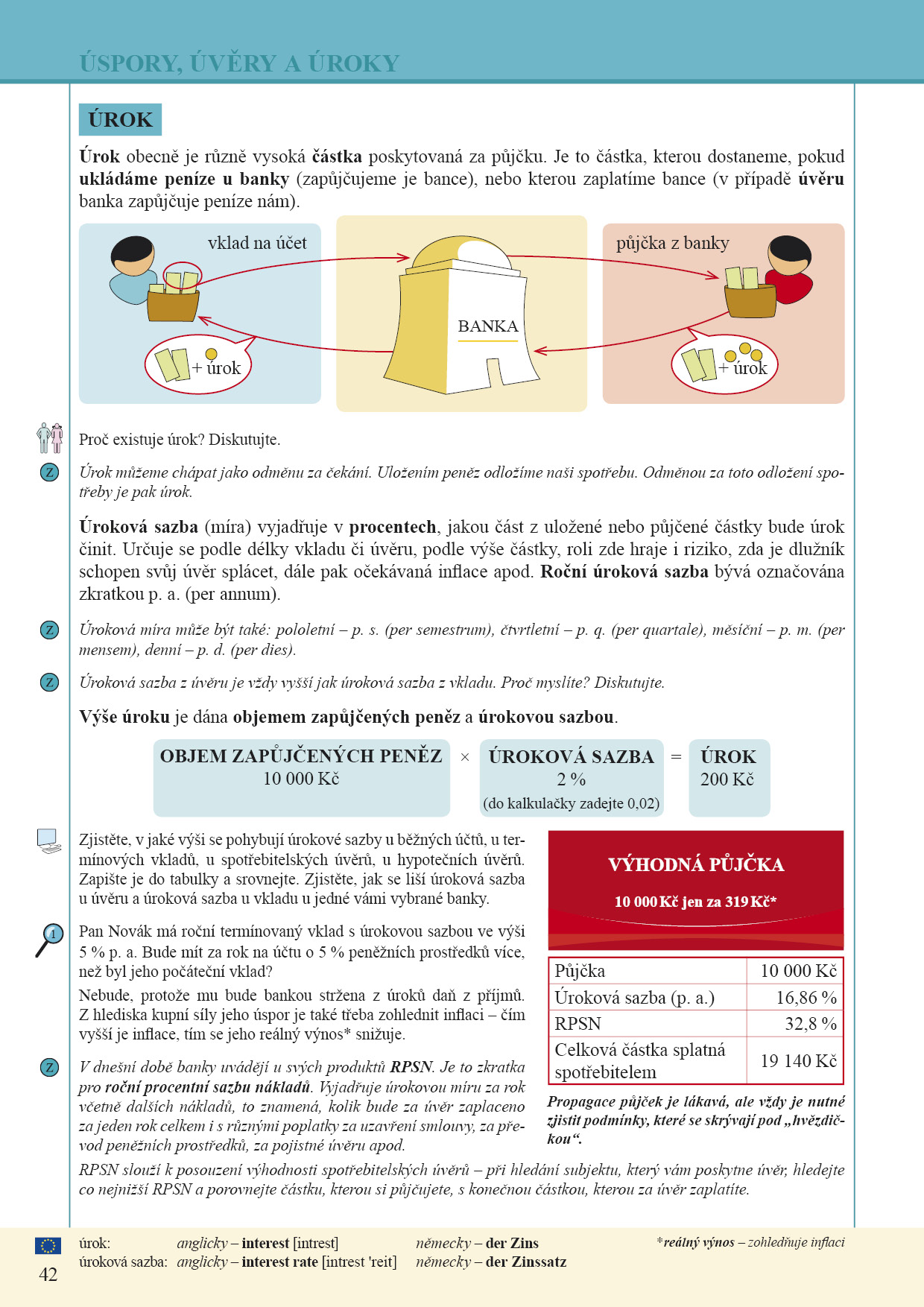 - Jsou zde zařazeny podkapitoly Hospodaření domácnosti, Trh výrobků a služeb a především Úspory, úvěry a úroky, kde jsou pro žáky připraveny názorná schémata a praktické příklady.